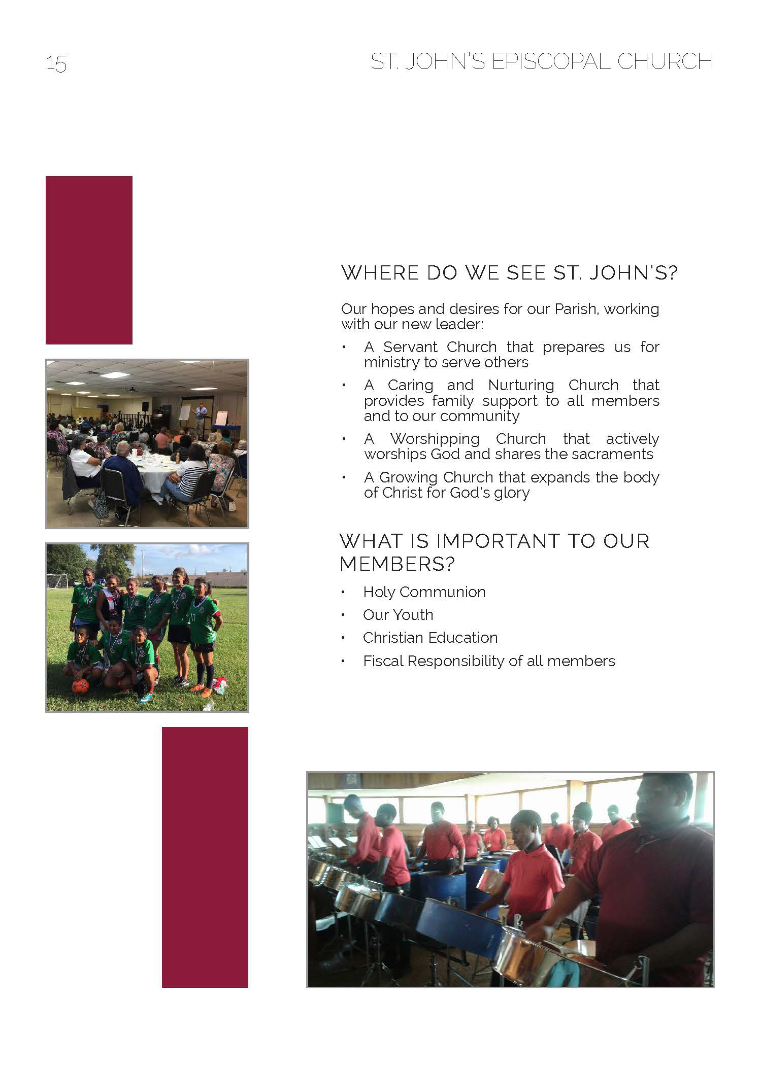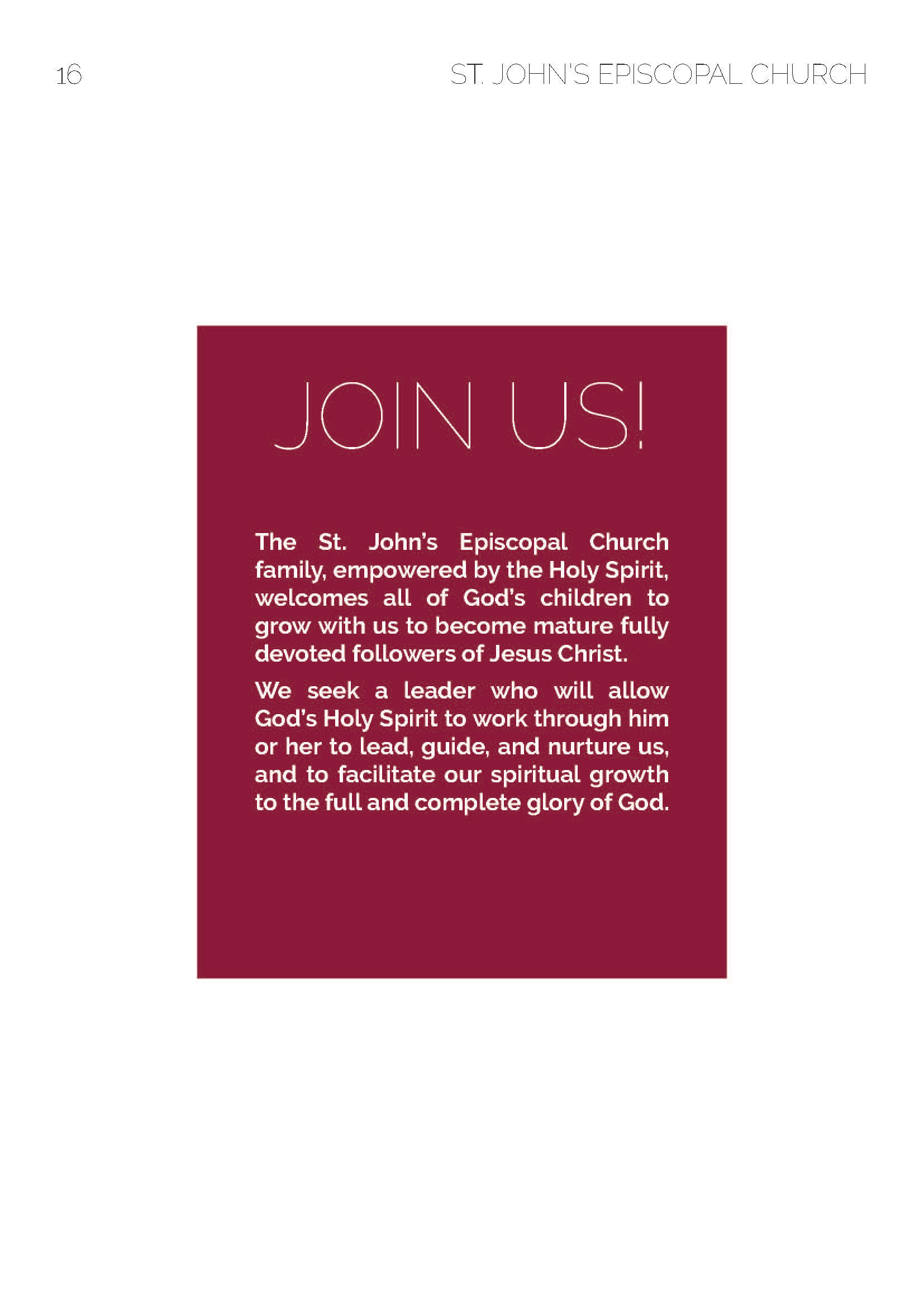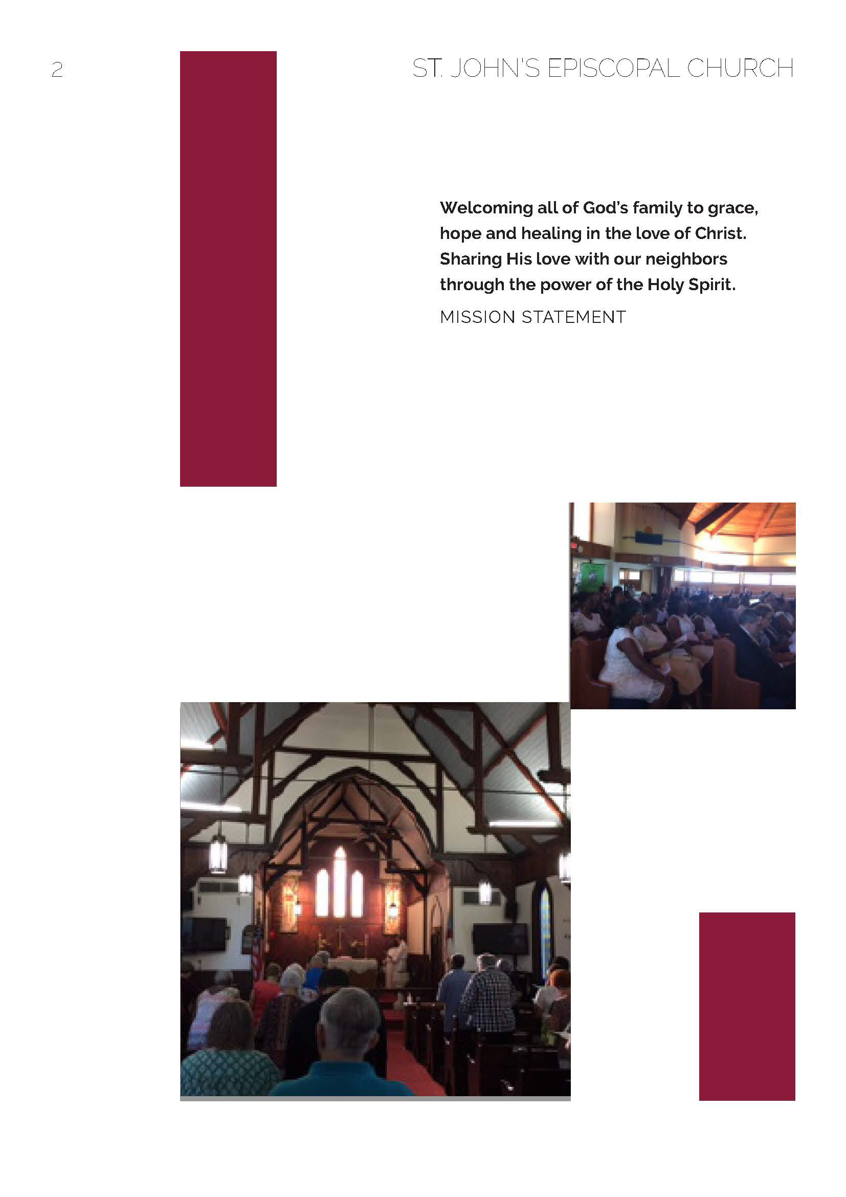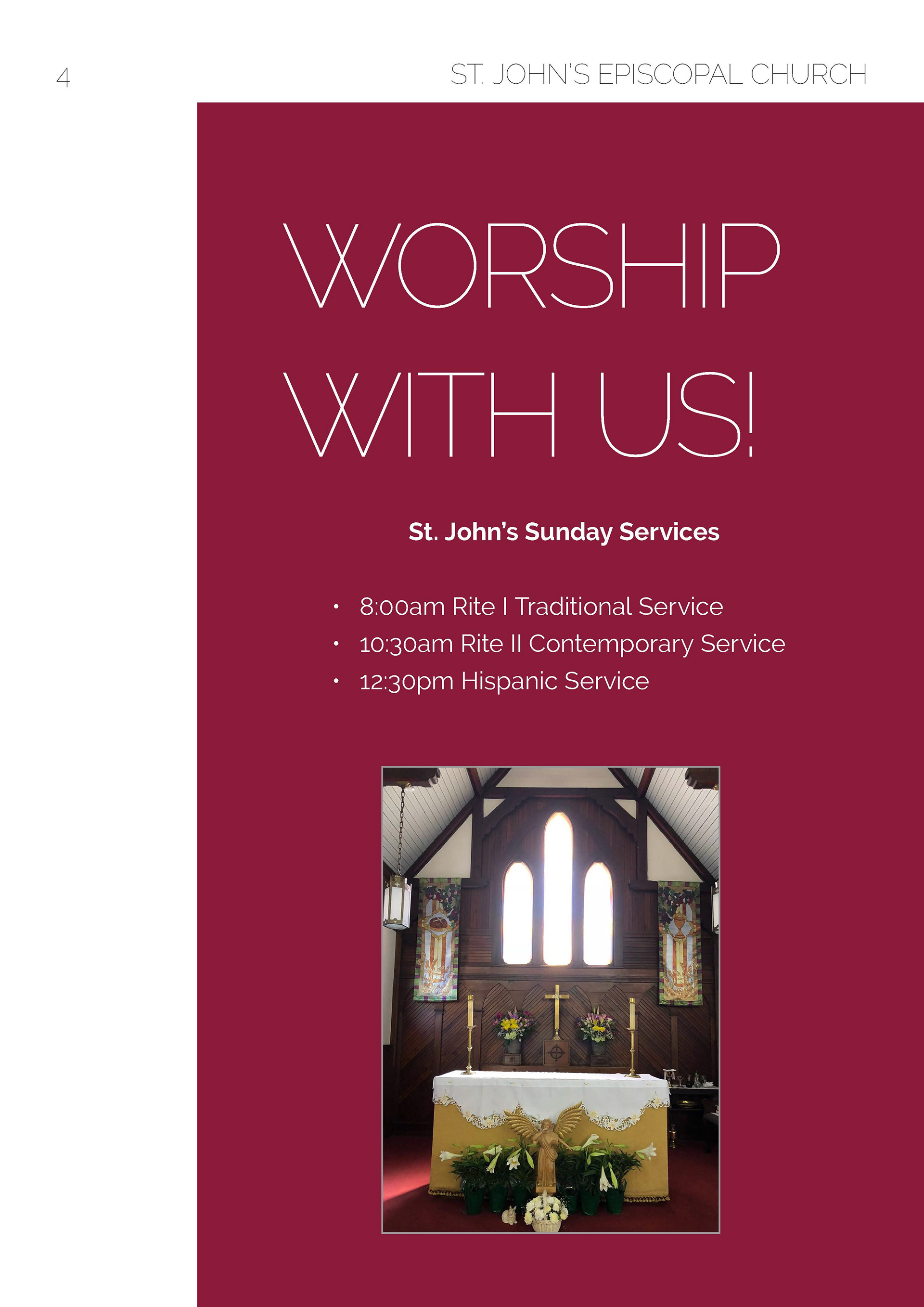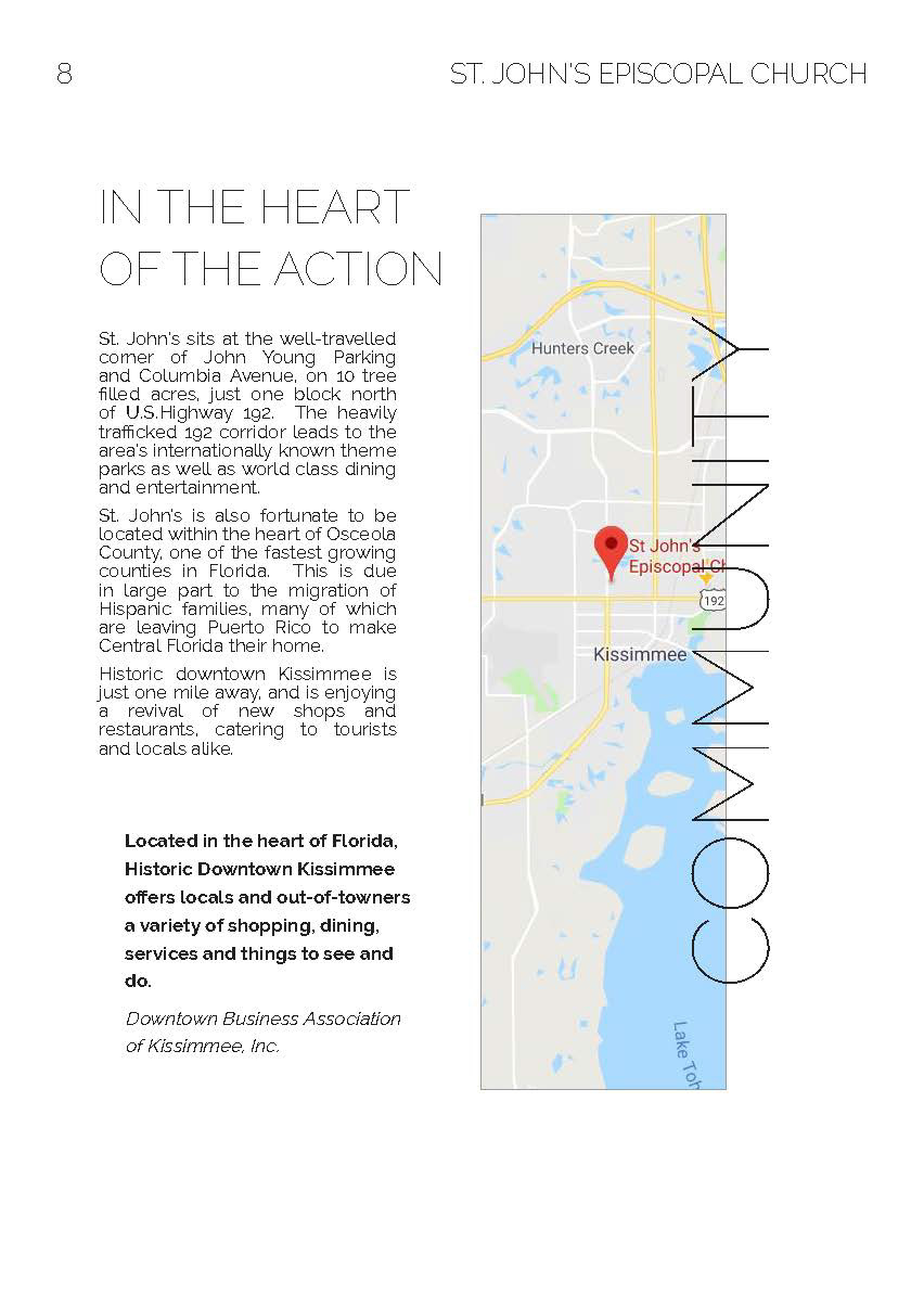A 2018 Project requested by St. John's Episcopal Church. St. John's Informational booklet was designed for new members of the church to learn about the church and the ways they can get involved in serving the community.